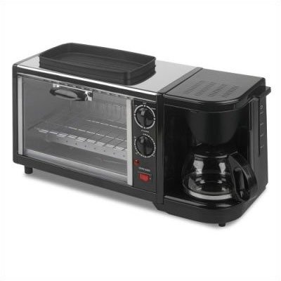 Make hot coffee, crisp toast, and a fried egg with this unique three-in-one breakfast set. The appliance combines a mini toaster oven, a coffeemaker, and a griddle into one compact unit--great for college dorms or countertops with limited space. The unit's 800-watt toaster oven can warm or toast breads, heat pot pies, or cook mid-size frounceen foods, while its griddle allows for cooking up an egg, hamburger, pancake, or sausages. In addition, its 650-watt coffeemaker brews 4- to 6-cups of coffe