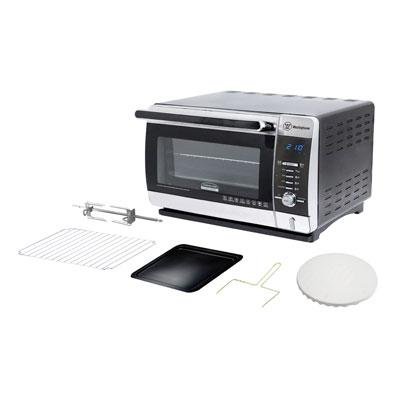 1200-Watt Digital oven with radiant, convection and steam cooking functions with 0.8 c ft. stainless steel interior with rotisserie. Combines 3 cooking technologies (traditional radiant, hot air convection, and high temperature controlled steam vapor) into one multi-function countertop appliance. Digital Controls with Blue LED Display, 6 quick easy accessible cooking functions, 10 pre-programmed cooking menus, 2 built in cleaning functions,with cool touch handle and full view double glass door.